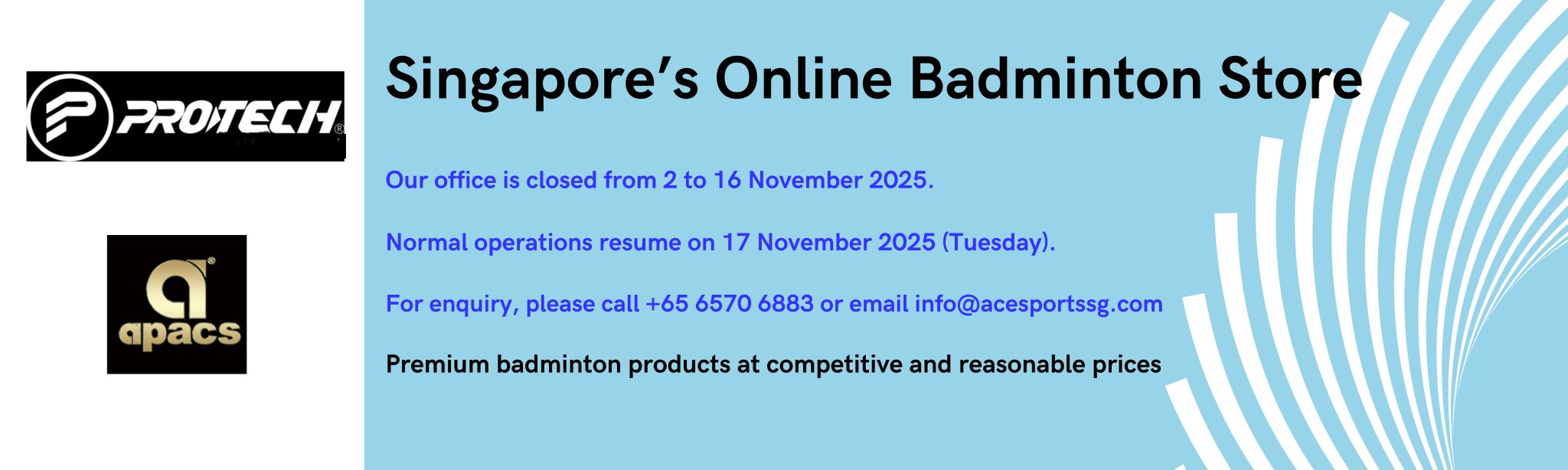 ACE Sports SG is the authorised sole and exclusive distributor of ProTech SG® and APACS® badminton products in Singapore. Both ProTech® and APACS® are Singapore registered trademarks, which we are the proprietary trademark holders in Singapore.